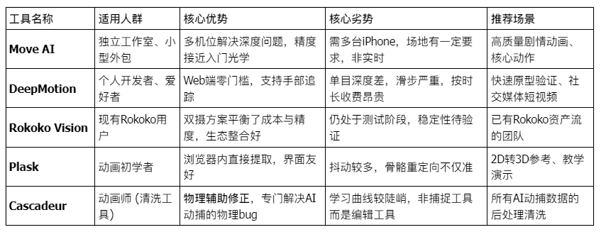 表 A-1:2025年主流AI视频动捕工具横向评测