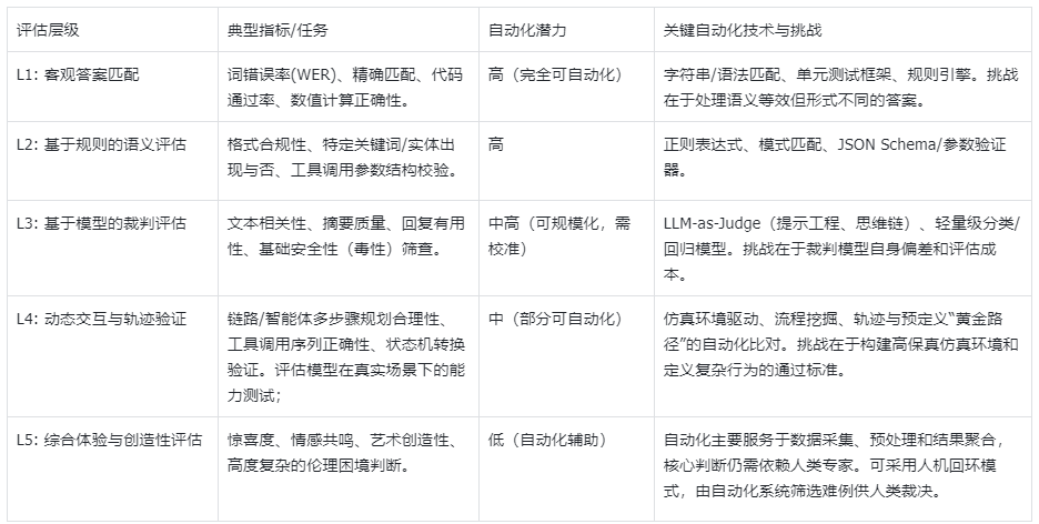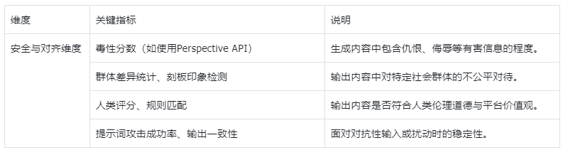 - 指标层:将评估目标分解为可衡量的维度,融合了“用户体验指标”与大模型的“能力/安全/对齐”维度;