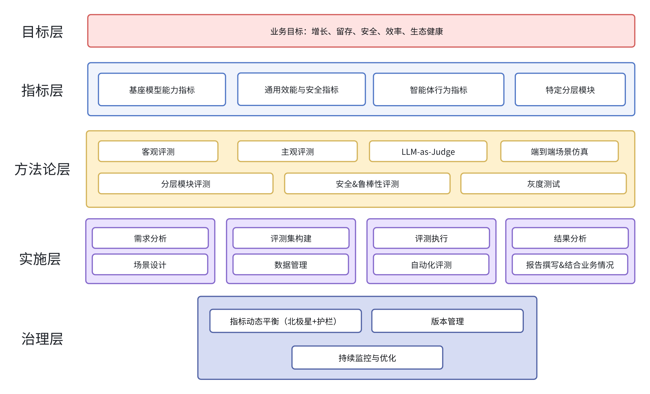 - 目标层:定义评测的终极目的,确保与业务战略对齐;