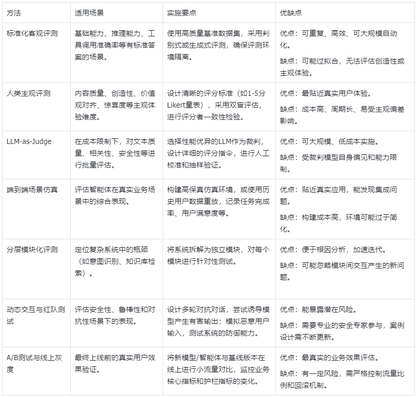 - 方法论层:提供评估工具箱,根据评估目标选择合适方法;