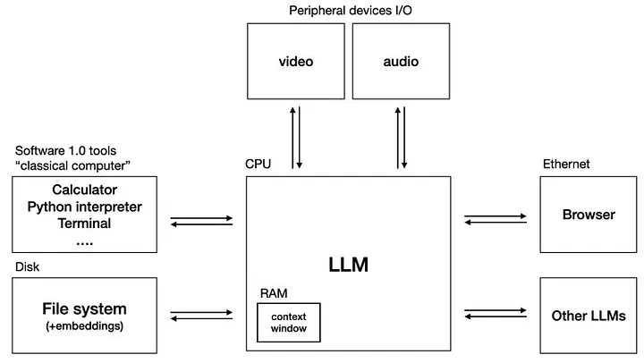 Andrej Karpathy著名的“LLM OS”架构图,展示大模型(CPU/RAM)正在吃掉原本属于应用层的空间