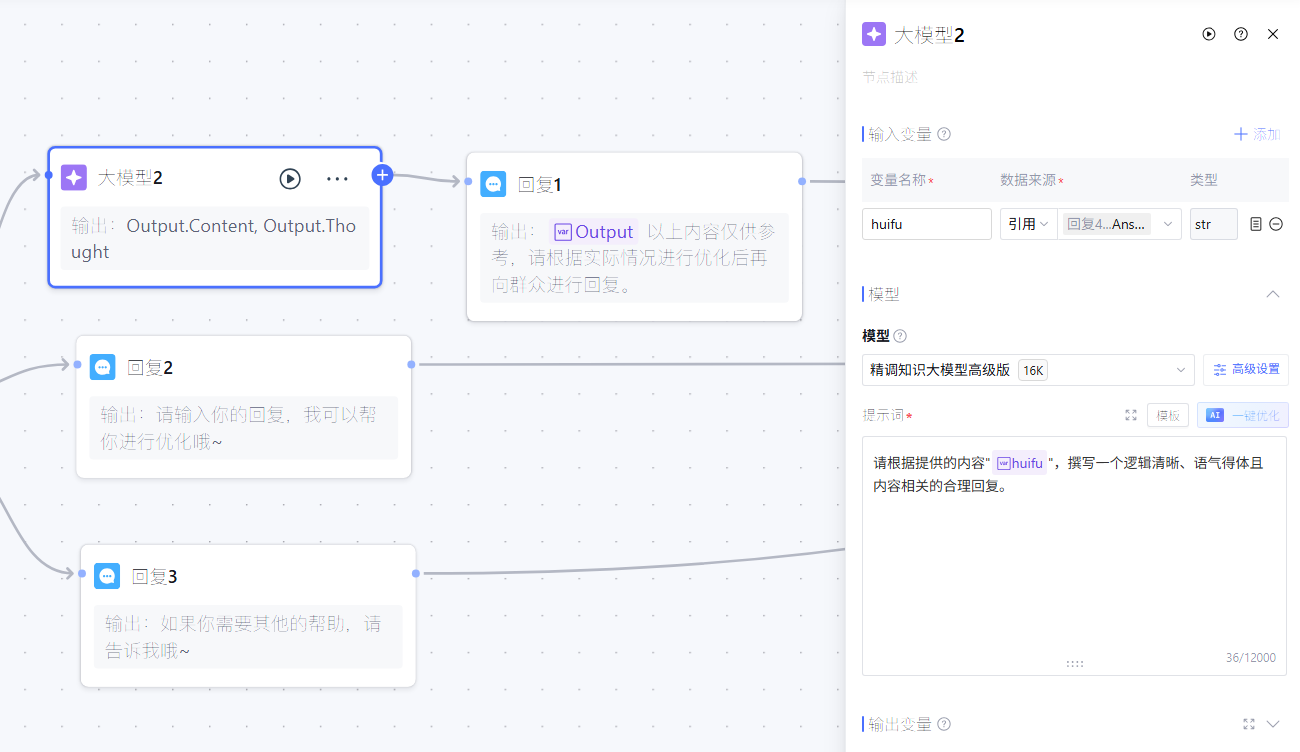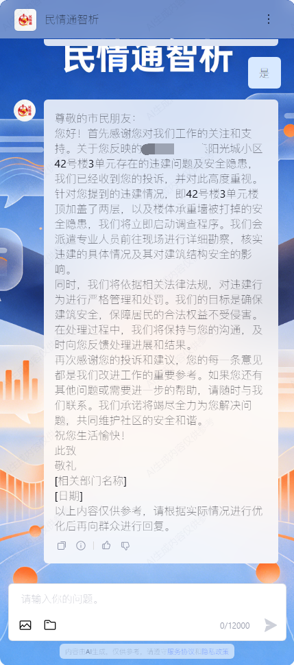 第二步增加智能回复辅助功能,根据提取的核心信息生成标准化回复文案,帮助工作人员快速完成反馈;