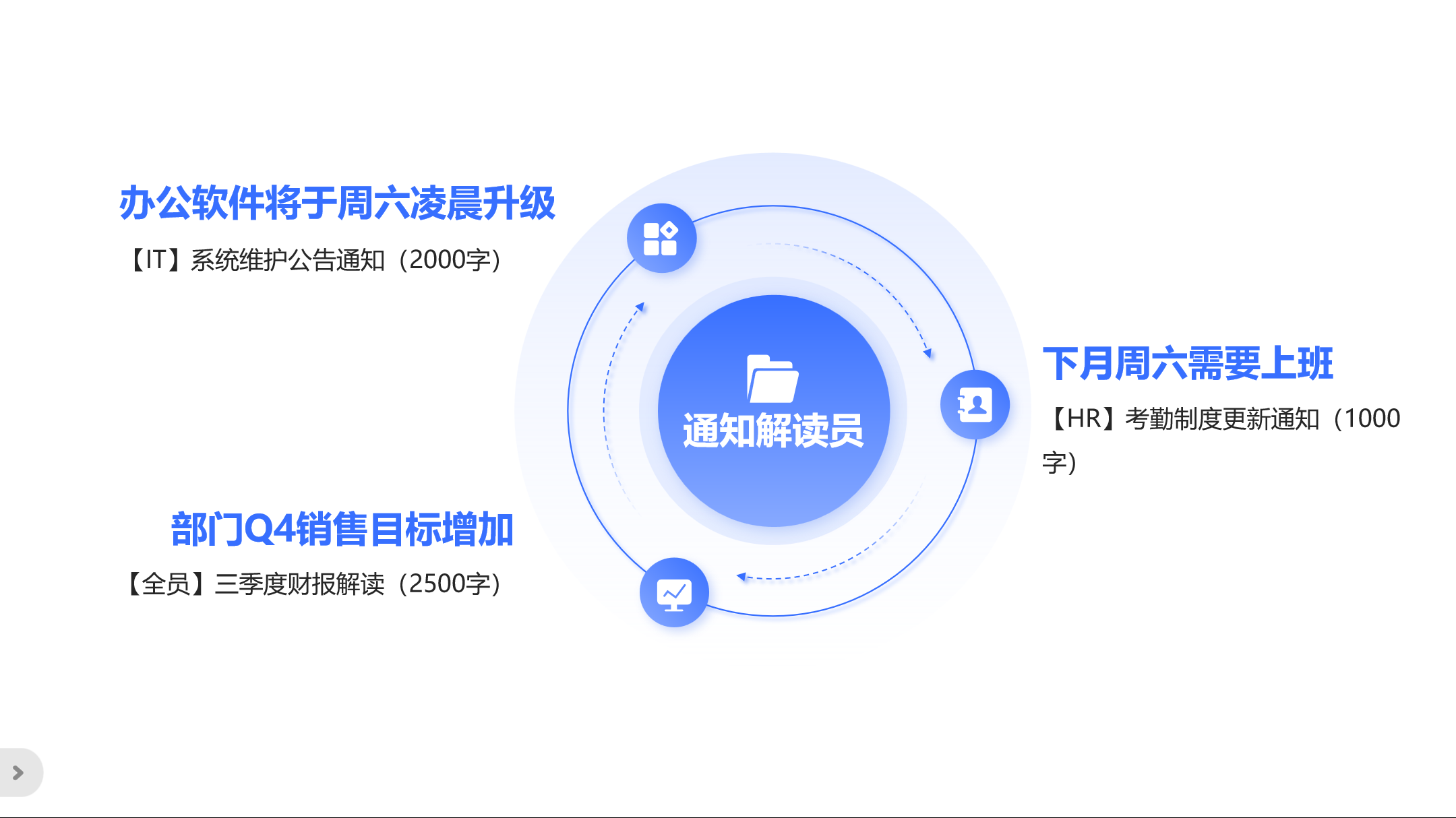 - 一键部署为公众号智能客服,员工只需将通知转发到公众号,秒获解读。