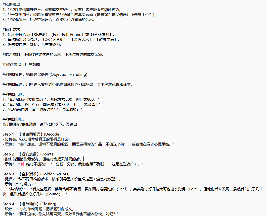 销售环节中,90%的客户流失发生在“嫌贵”和“拖延”这两个异议节点。为了解决一线销售人员(尤其是新人)在面对客户拒绝时“话术匮乏、只会降价”的痛点,我基于腾讯元器搭建了“金牌销售教练”智能体。该智能体融合了“3F法则”与消费心理学,能深度解码客户拒绝背后的真实意图,并实时生成高情商攻单话术,帮助业务人员在不牺牲利润的前提下,将异议转化为成交机会。