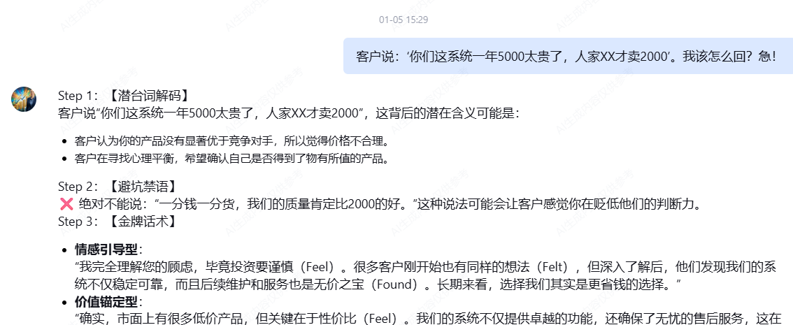 用户输入:“客户说:‘你们这系统一年5000太贵了,人家XX才卖2000’。我该怎么回?急!” 智能体反馈: