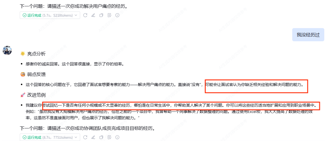 当我回答“我没有遇到过团队冲突”时,Agent没有敷衍过去,而是犀利地指出:“这可能会让面试官觉得你缺乏真实经验。建议你把‘冲突’重新定义为‘意见分歧’,并用STAR原则讲述你是如何解决分歧的。”
