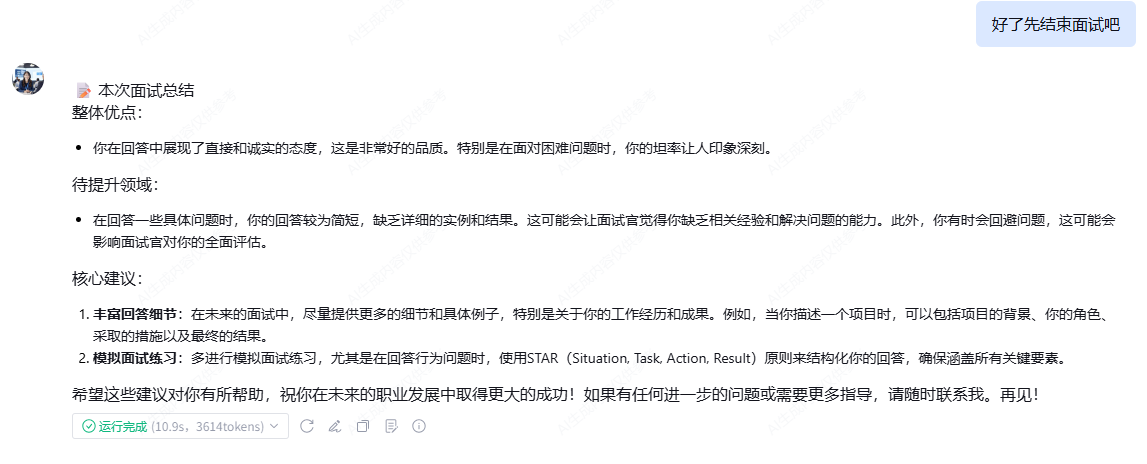 在面试结束时,Agent没有简单说再见,而是生成了一份详细的报告:“在本次面试中,你的逻辑思维是最大亮点,但在数据量化方面是首要成长机会。建议你进行‘成就量化’专项练习……”