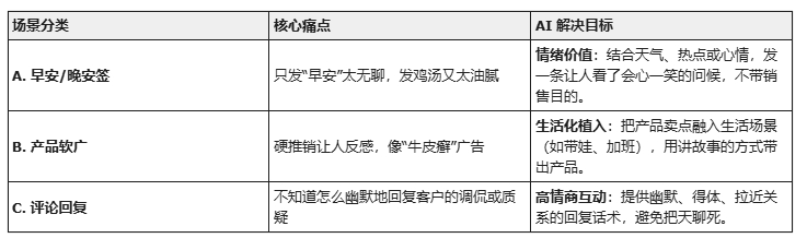 在动手前,别急着创建,先像做产品一样把核心需求列清楚。我们复盘了销售发朋友圈最容易“翻车”的三个场景,整理了一份需求表: