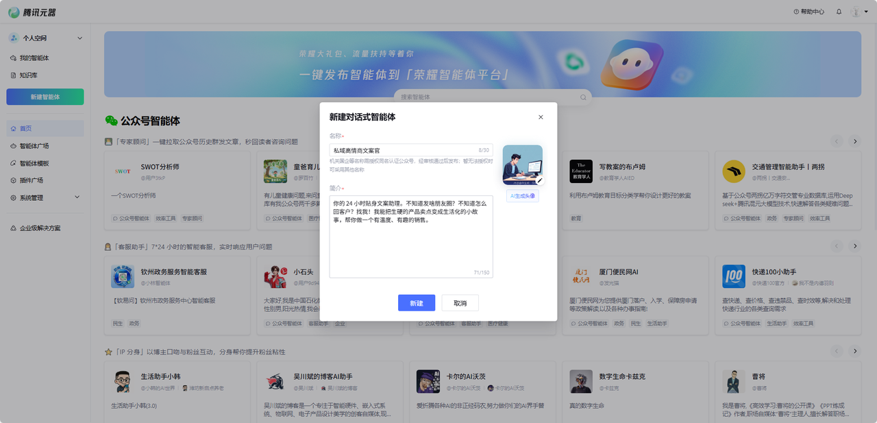 就在我准备花钱买那种“365天朋友圈文案库”时,我灵机一动:为什么不用腾讯元器捏一个懂人性、高情商的文案助手?