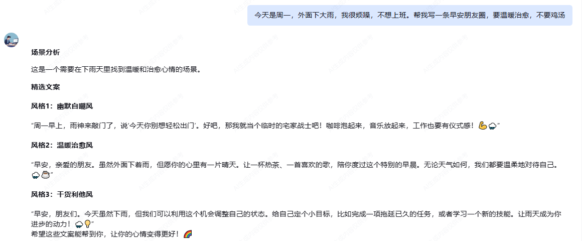 测试指令: “今天是周一,外面下大雨,我很烦躁,不想上班。帮我写一条早安朋友圈,要温暖治愈,不要鸡汤。”