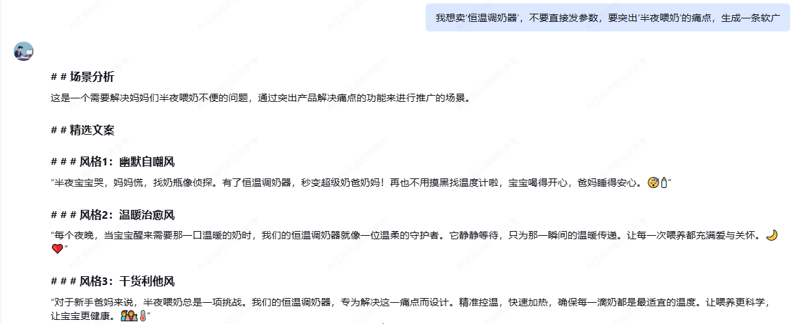 测试指令: “我想卖‘恒温调奶器’,不要直接发参数,要突出‘半夜喂奶’的痛点,生成一条软广。”