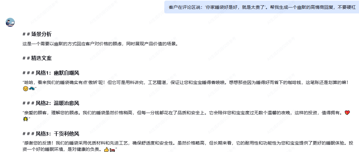 测试指令: “客户在评论区说:‘你家睡袋好是好,就是太贵了’。帮我生成一个幽默的高情商回复,不要硬杠。”