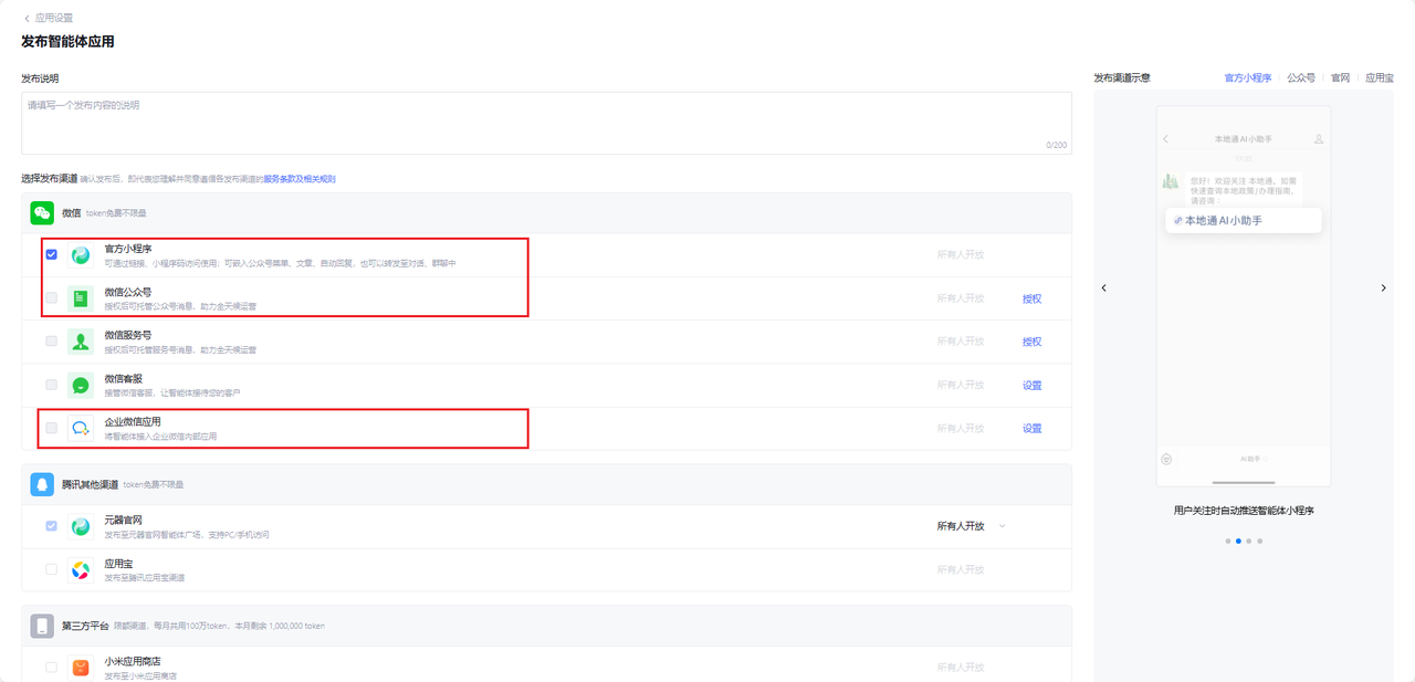 通过测试后,点击【发布】,既然是做私域,战地就在微信。腾讯元器最强大的地方在于它能原生接入微信生态: