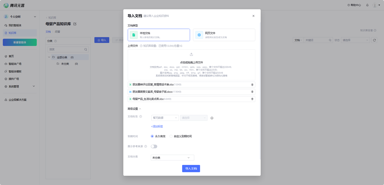 光有指令不够,AI 得懂你的产品和行业“黑话”。在 【知识库】 板块,我直接上传了准备好的三份核心文档:
