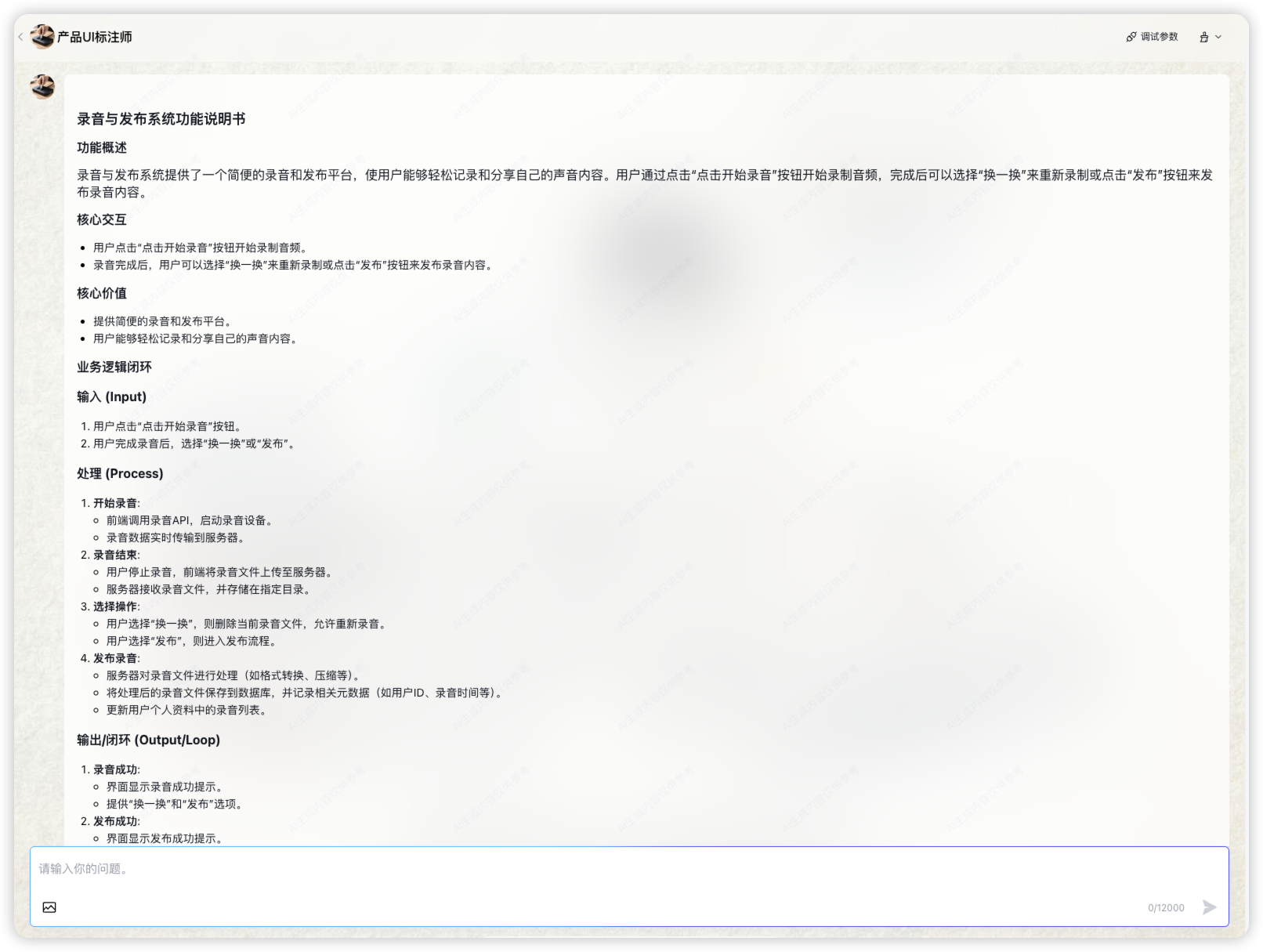 基于此 Agent 结构,当用户上传一张录音功能 UI 界面的时候,你就会得到如下一篇非常之详细、可以直接 CV 复用的产品功能说明书!