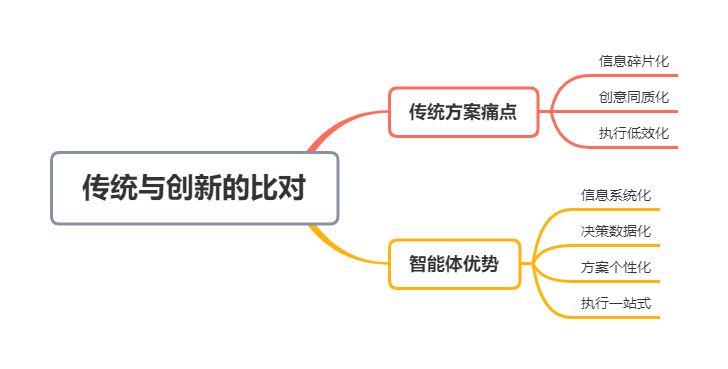 - 策划效率低下:策划一场节日活动,需要先在社交媒体搜索灵感,再整理10个候选方案,并比对预算可行性,然后设计物料清单并联系供应商采购,最后制作执行时间表。这个过程至少耗时2个工作日,遇到大型活动,至少要提前1个月开始准备,但是真正具有创造性的环节不足20%,其中大量的时间消耗在信息搜集、比价协调等重复性劳动上。