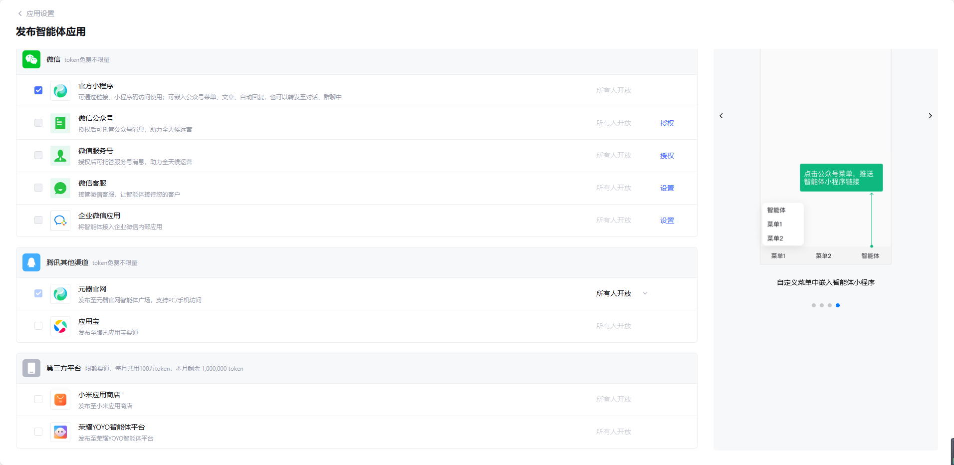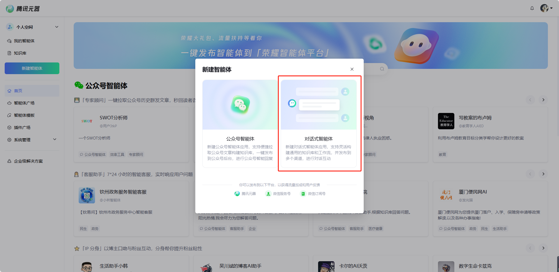 这里我们看到,腾讯元器基于腾讯生态,可以直接发布到小程序和公众号进行使用,简直不要太方便。