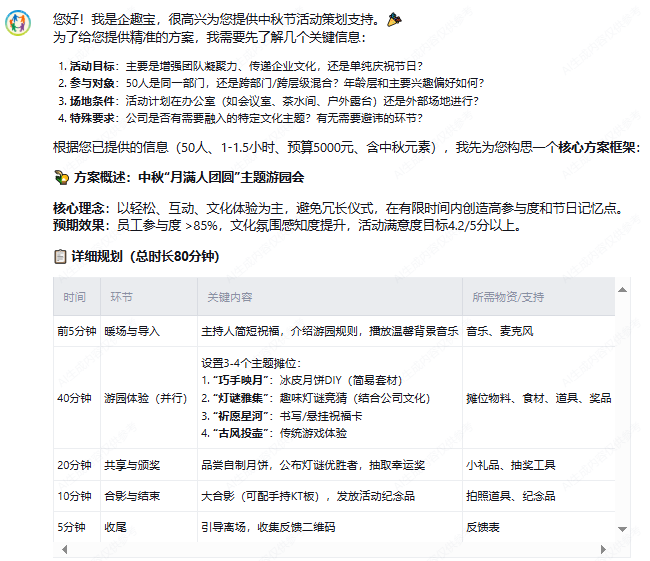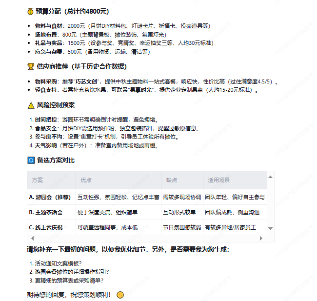 - 知识库整合:内置企业文化、过往活动案例、供应商信息等。