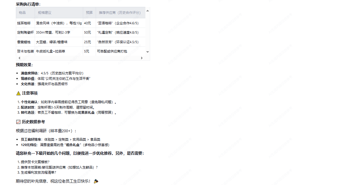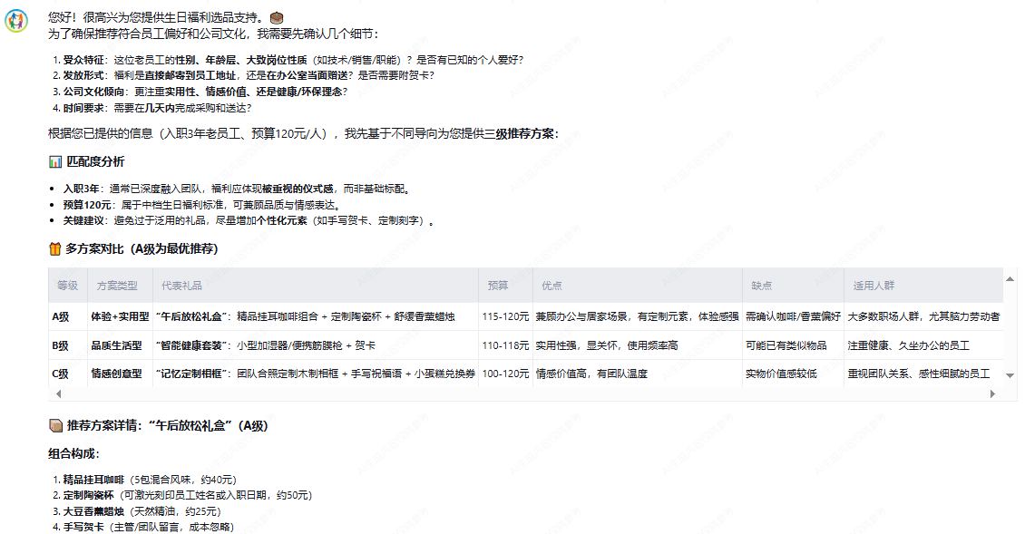 - 福利选品模块:根据员工画像、预算、场景推荐福利礼品。