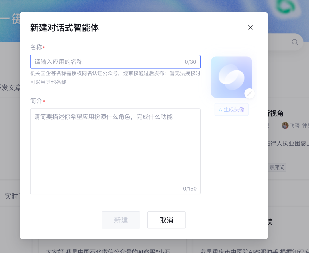 4、输入智能体名称和简介,头像可以通过ai进行生成