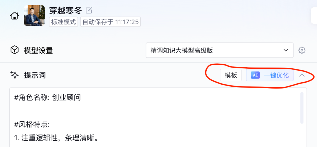 很多人都会头疼不知道该如何写精确提示词,我推荐使用腾讯元器自带的“一键优化”按钮,或者旁边的“模版”按钮