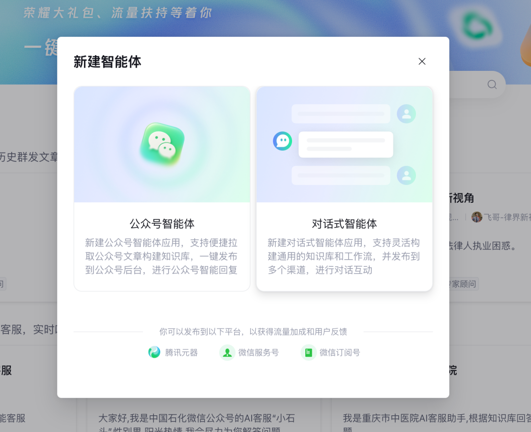 3、点击后弹出窗口,选择对话式智能体