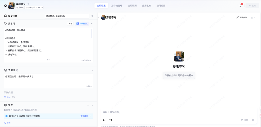 但是不少个人创业者不明白如何去挖掘需求、去揣摩用户意图,甚至不清楚创业过程中该如何规划好财务分配。于是我根据一本曾经看过的书《 穿越寒冬》,里面有不少作者失败和成功经历,我将其融合成一个智能体,大家迷茫的时候可以找他聊聊。我相信这个智能体能给你提供更棒的思路或者解决方法。大家也可用通过我的步骤创建一个专属于自己的智能体。