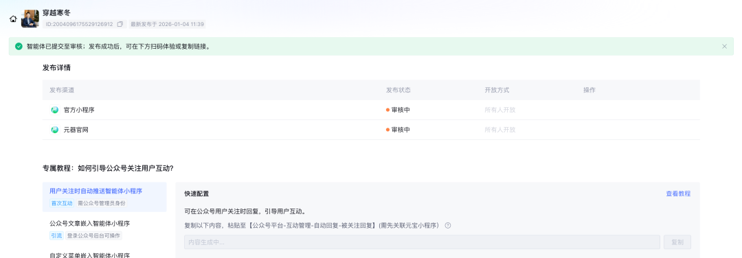 5、完成第四步骤后点击新建,跳转到智能体详情页面