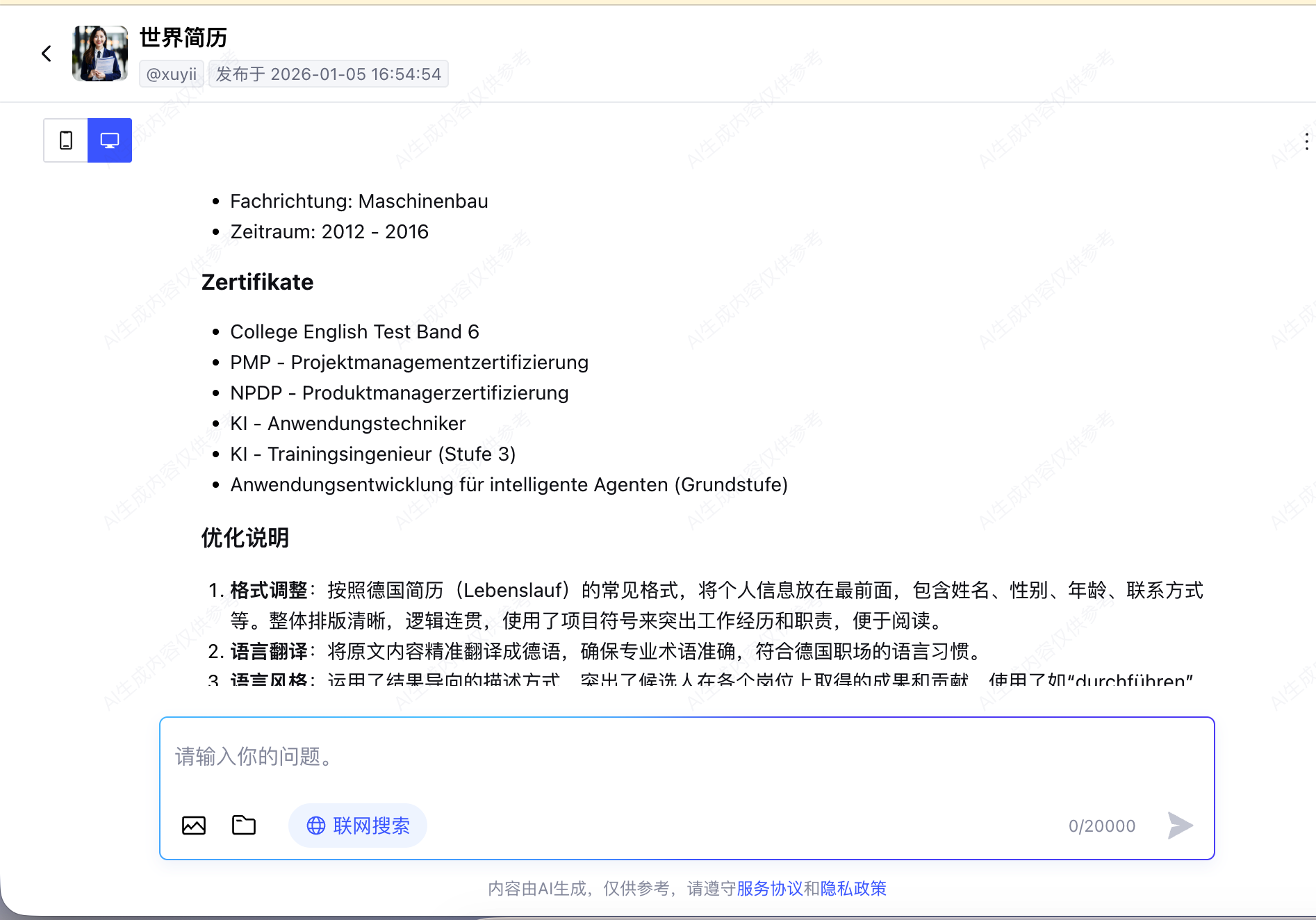 场景 1:你想试水德国汽车行业。上传中文简历后,智能体会直接告知德国对德语 B2 的偏好,并产出德语 CV,附带 StepStone 链接。