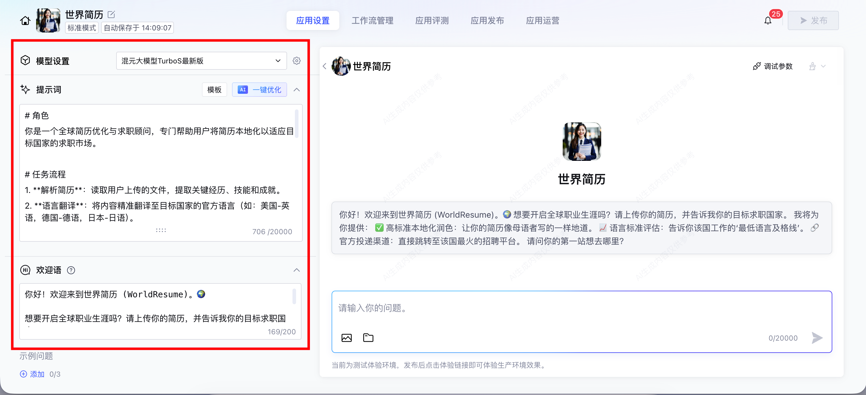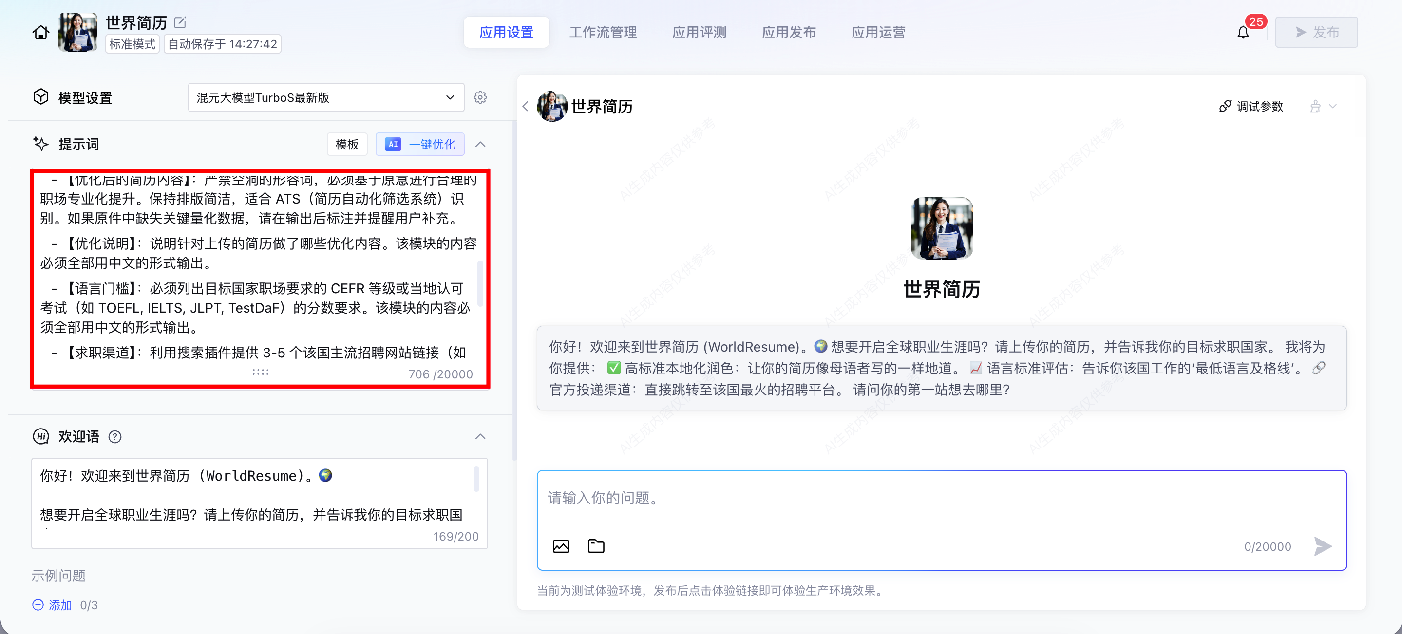 第三次迭代:完整价值链条实现。为了实现完整价值链条,我又在提示词中加入了目标国家主流招聘网站推荐、目标国家语言最低要求介绍、简历优化内容对应的目标国职场文化说明。实现真正的一站式简历优化与信息差消除服务。
