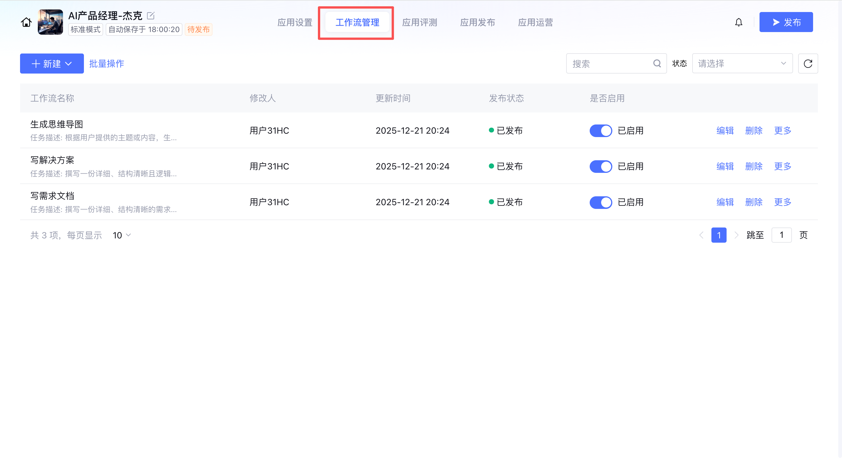 可以切换到工作流管理,在这里我分别创建了三个工作流: