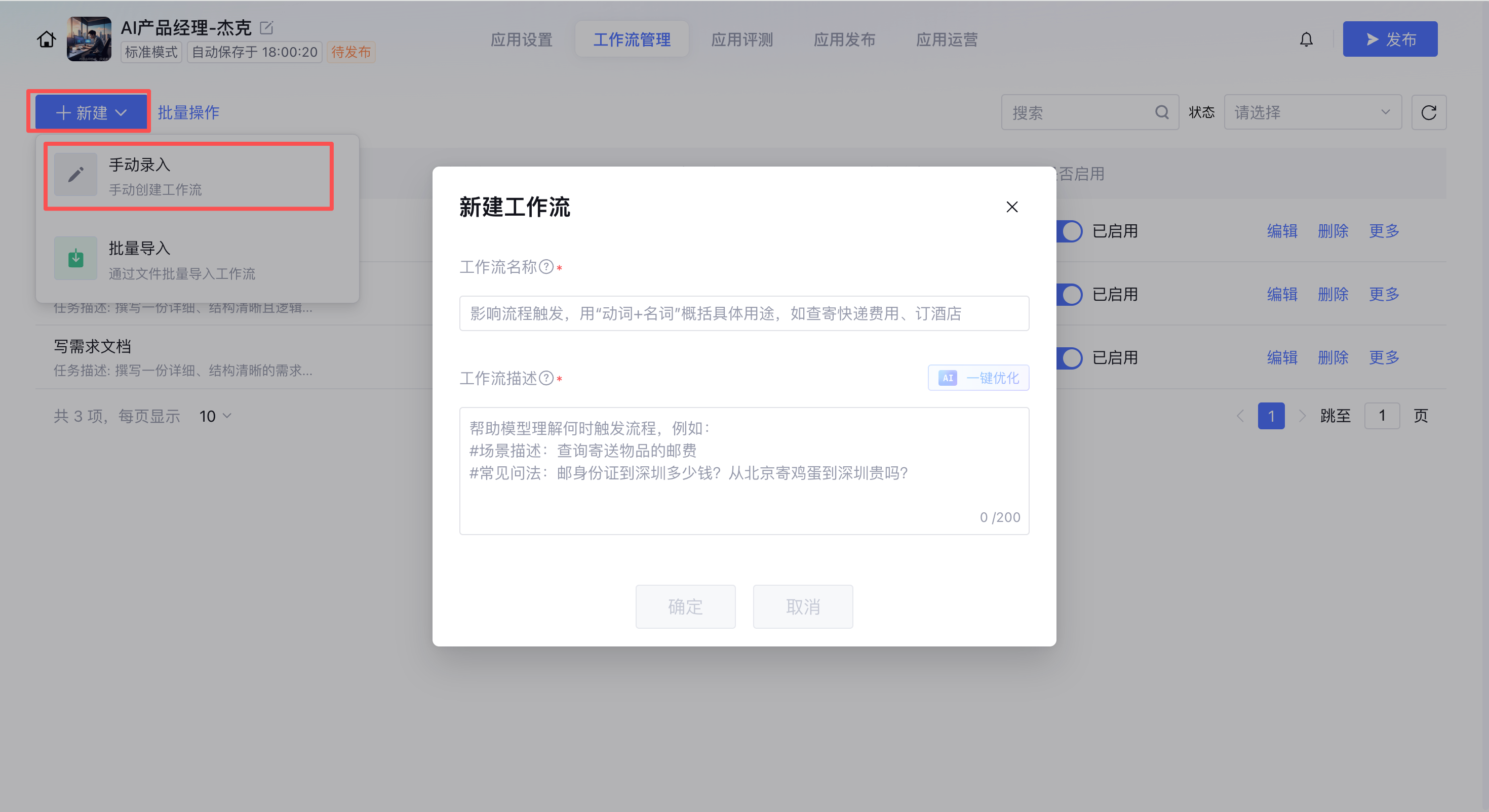 左侧新增可以创建工作流,输入名称以及描述即可。