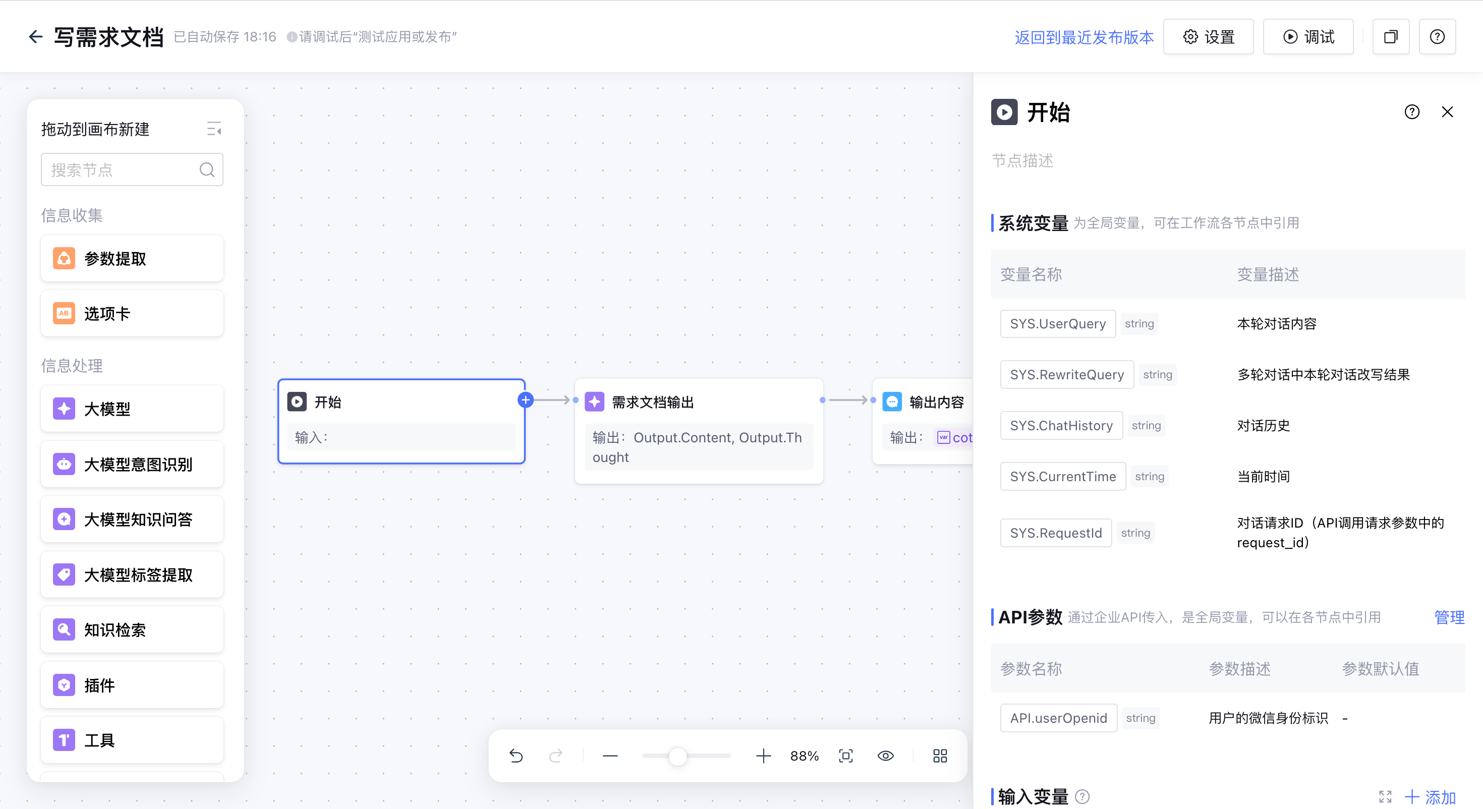 内置了很多系统变量,比如本轮对话、对话历史,如果没有特殊自定义参数可以不需要修改该节点。