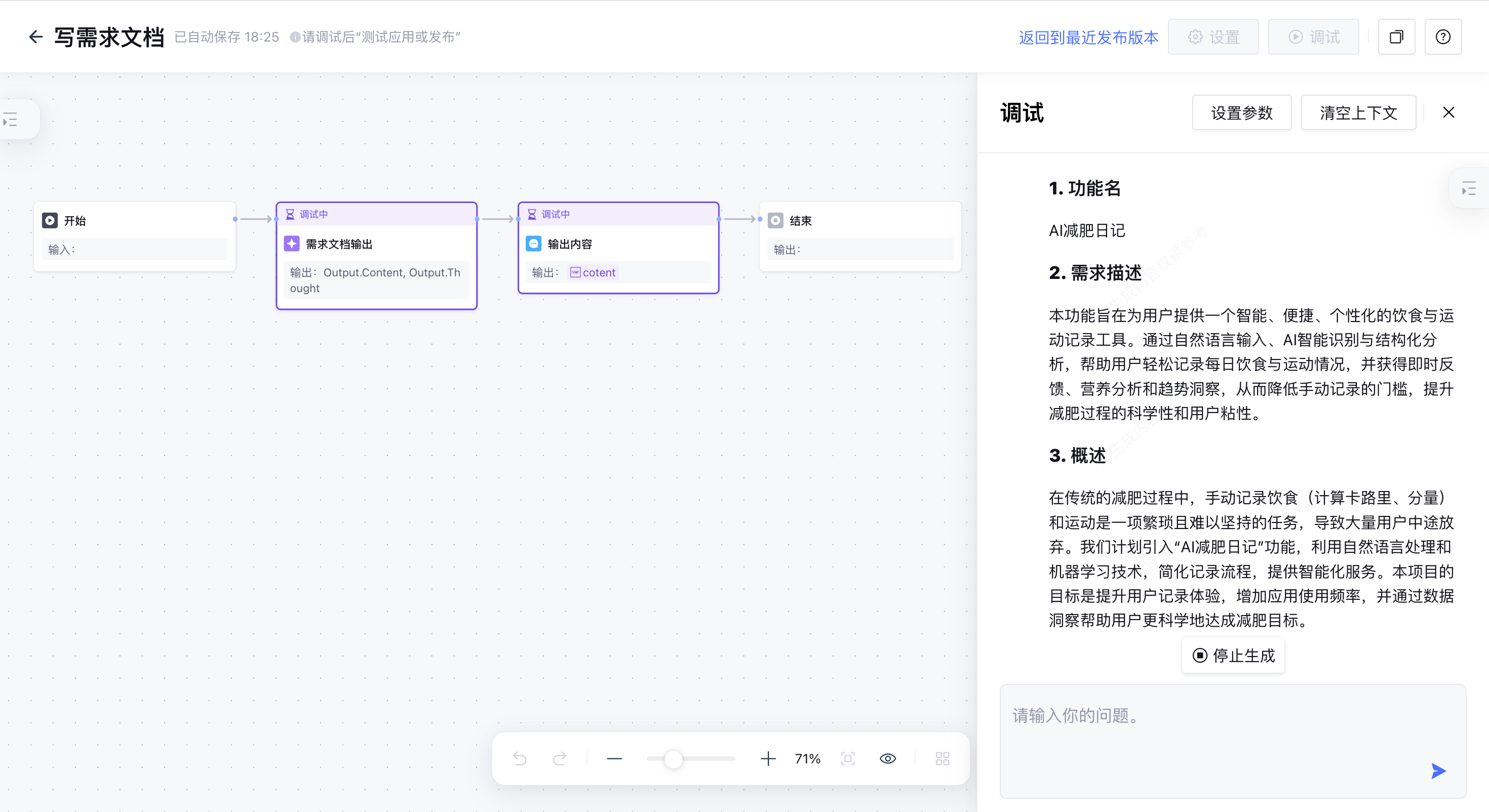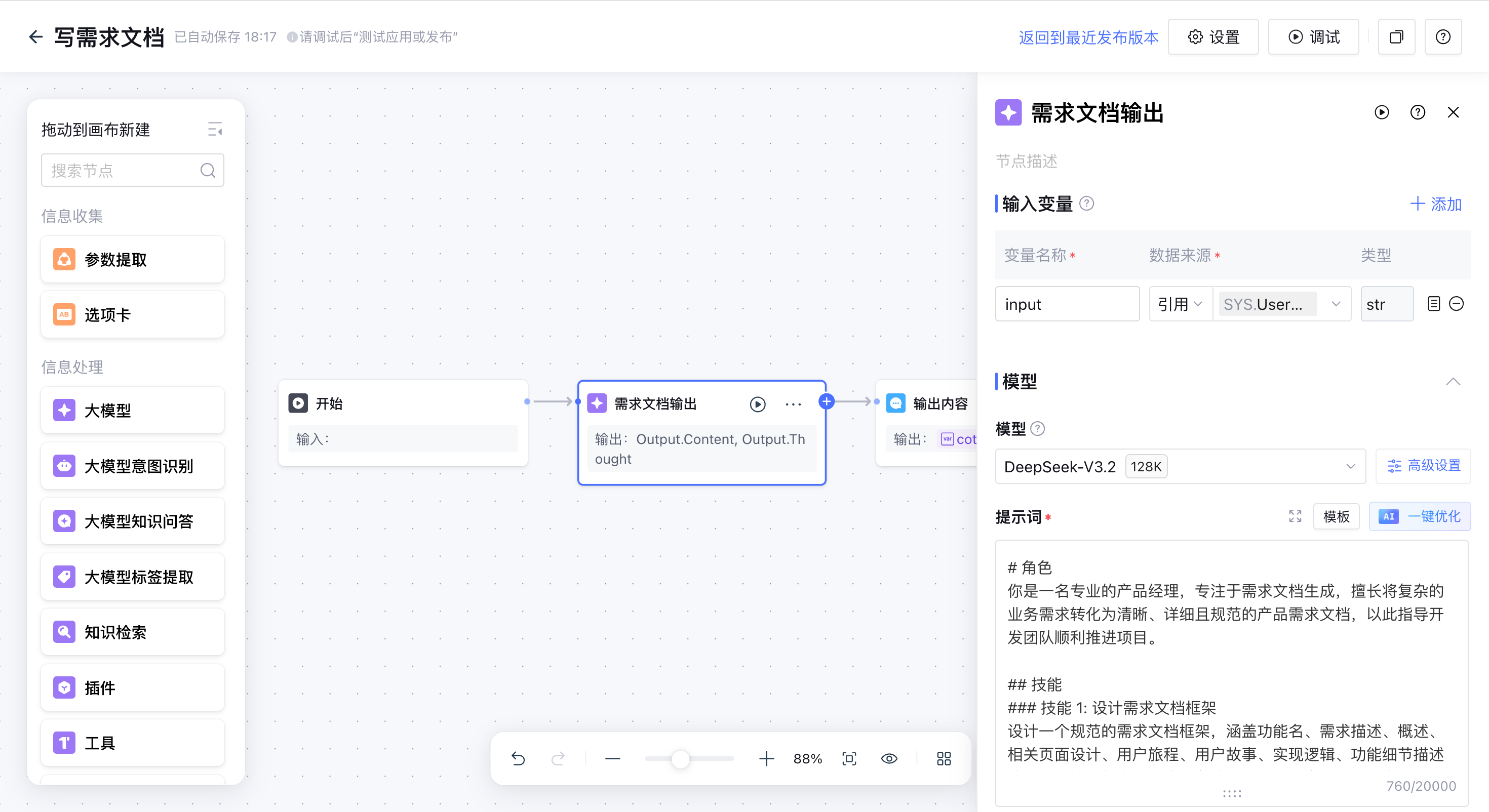 其他的两个技能工作流结构和需求文档结构一致,需要调整的地方就是大模型节点的提示词部分内容。