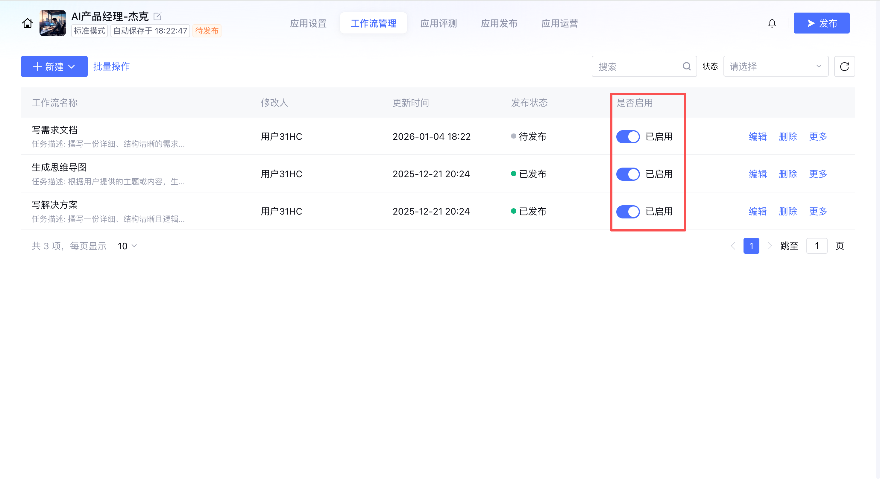 最后发布成功后一定要记得打开工作流的启用开关,默认为关闭状态,开启后生效。