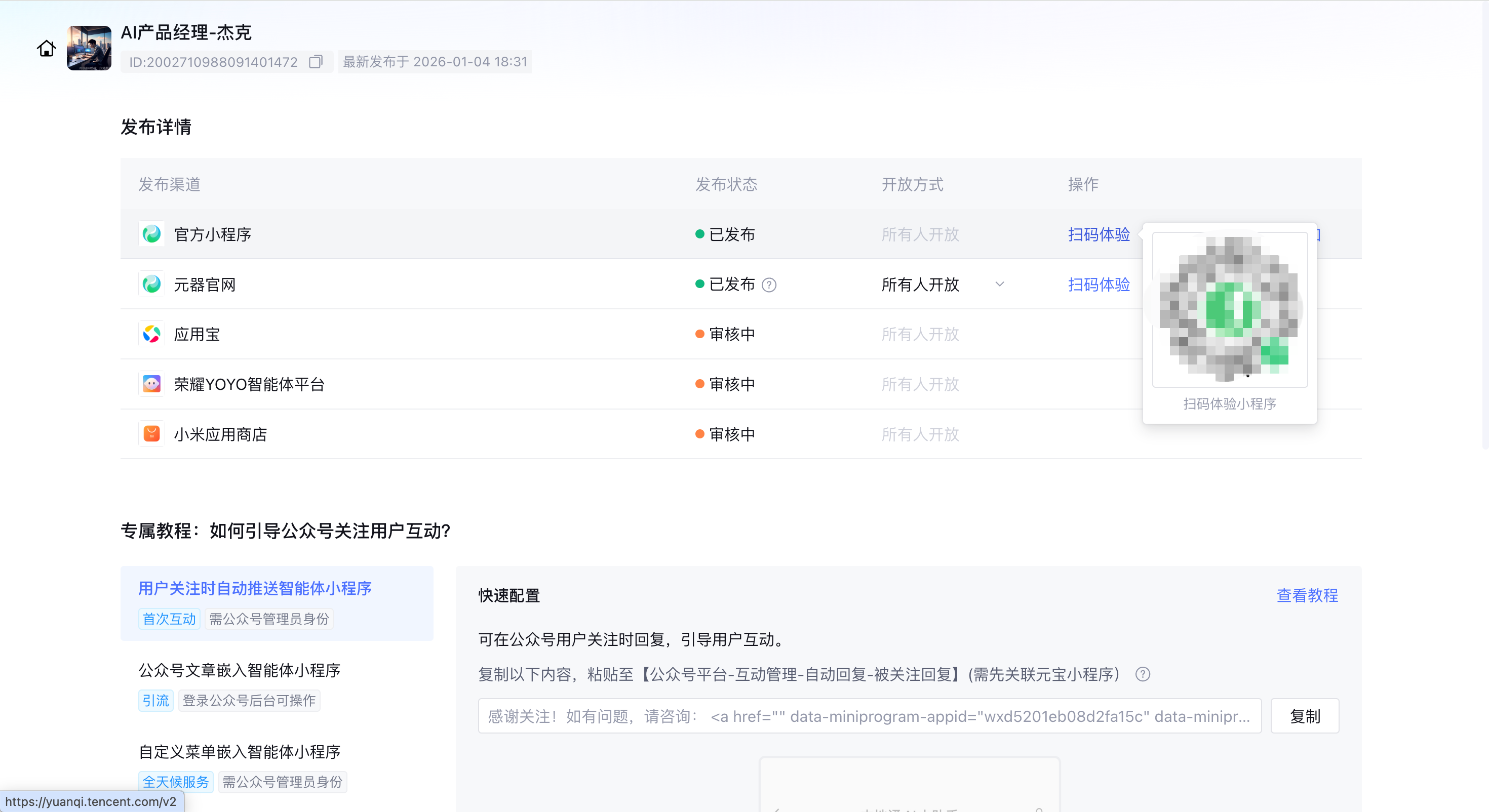 发布成功后可以直接扫码在元宝小程序中与智能体对话。