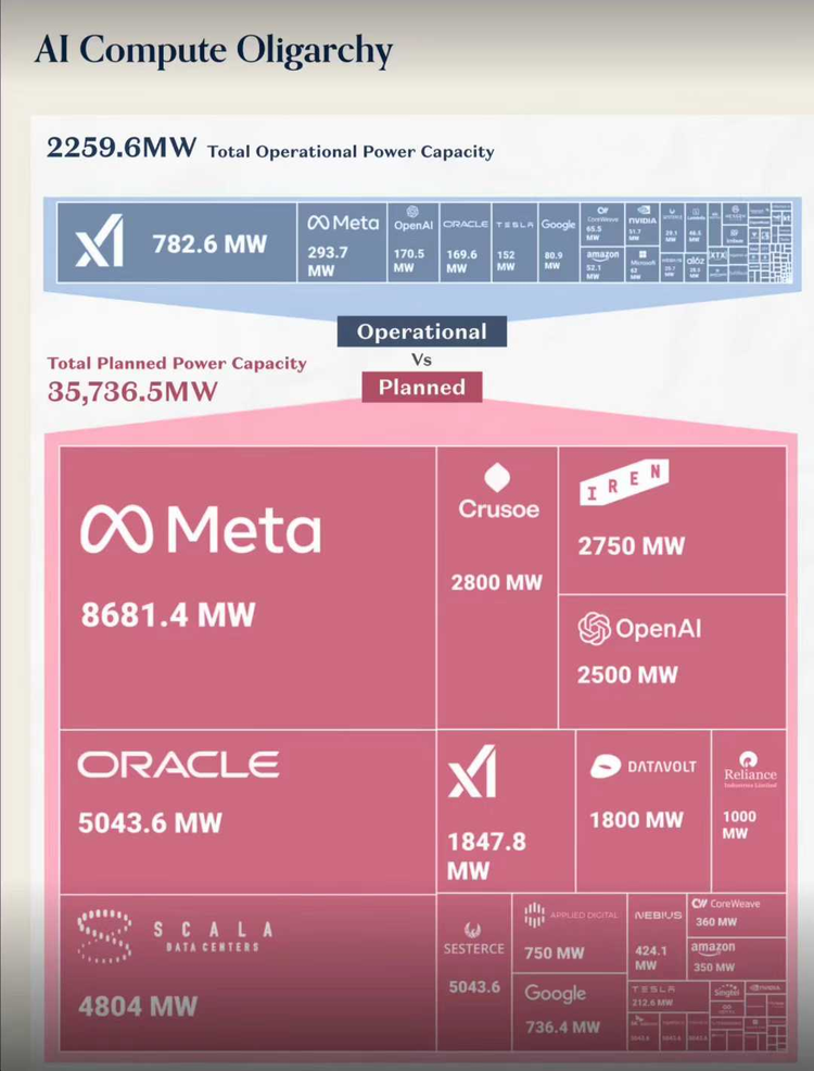 马斯克的xAI也是这个逻辑。他多次警告,目前 AI 最大的中长期瓶颈会从芯片,转向电力生产和电网,数据中心和 AI 集群会在未来几年吃掉极其可观的全球电力,对电网形成硬约束。再结合他疯狂堆GPU、建算力超级工厂/超级集群的行为,很难说他主观上相信再堆算力也没什么提升。