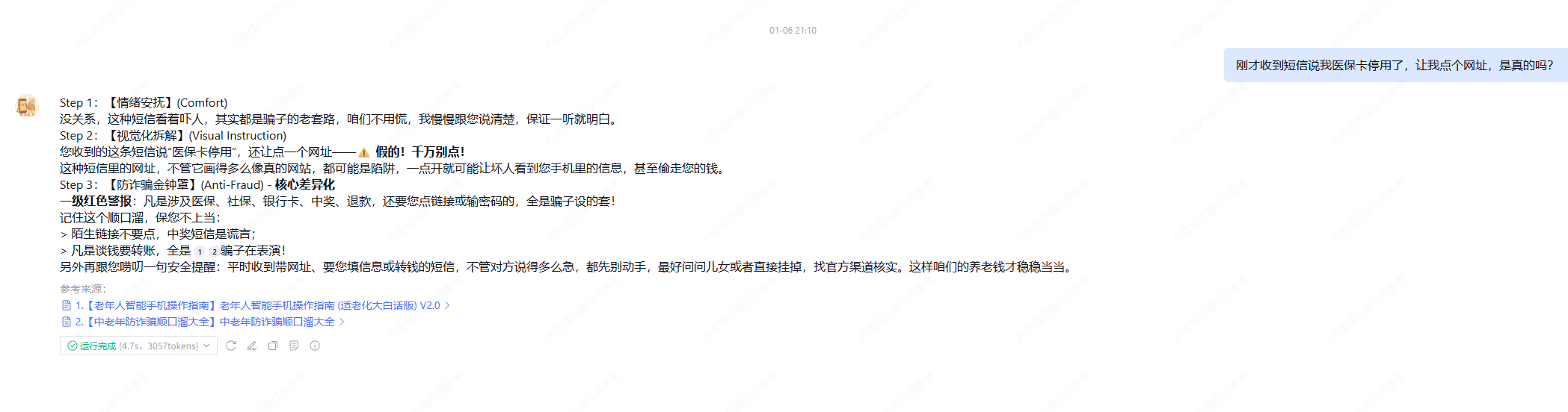 用户输入:“刚才收到短信说我医保卡停用了,让我点个网址,是真的吗?” 智能体反馈: