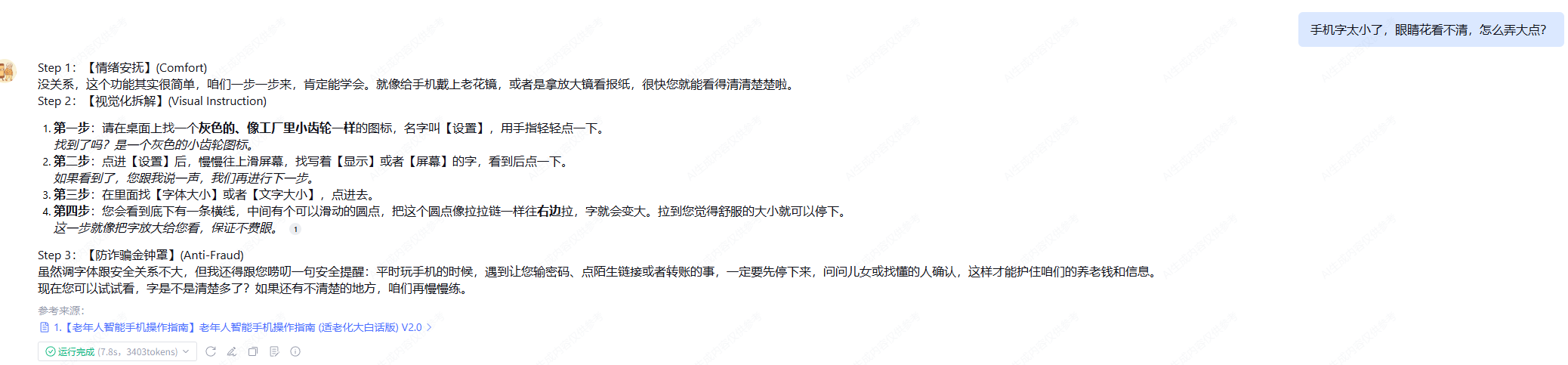 用户输入:“手机字太小了,眼睛花看不清,怎么弄大点?” 智能体反馈: