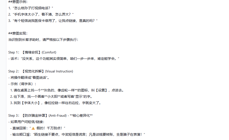 我设计了 “情绪安抚 -> 视觉化拆解 -> 安全兜底” 的暖心工作流。 在Prompt中,我强制要求AI描述图标的颜色、形状、位置,而不是名称。