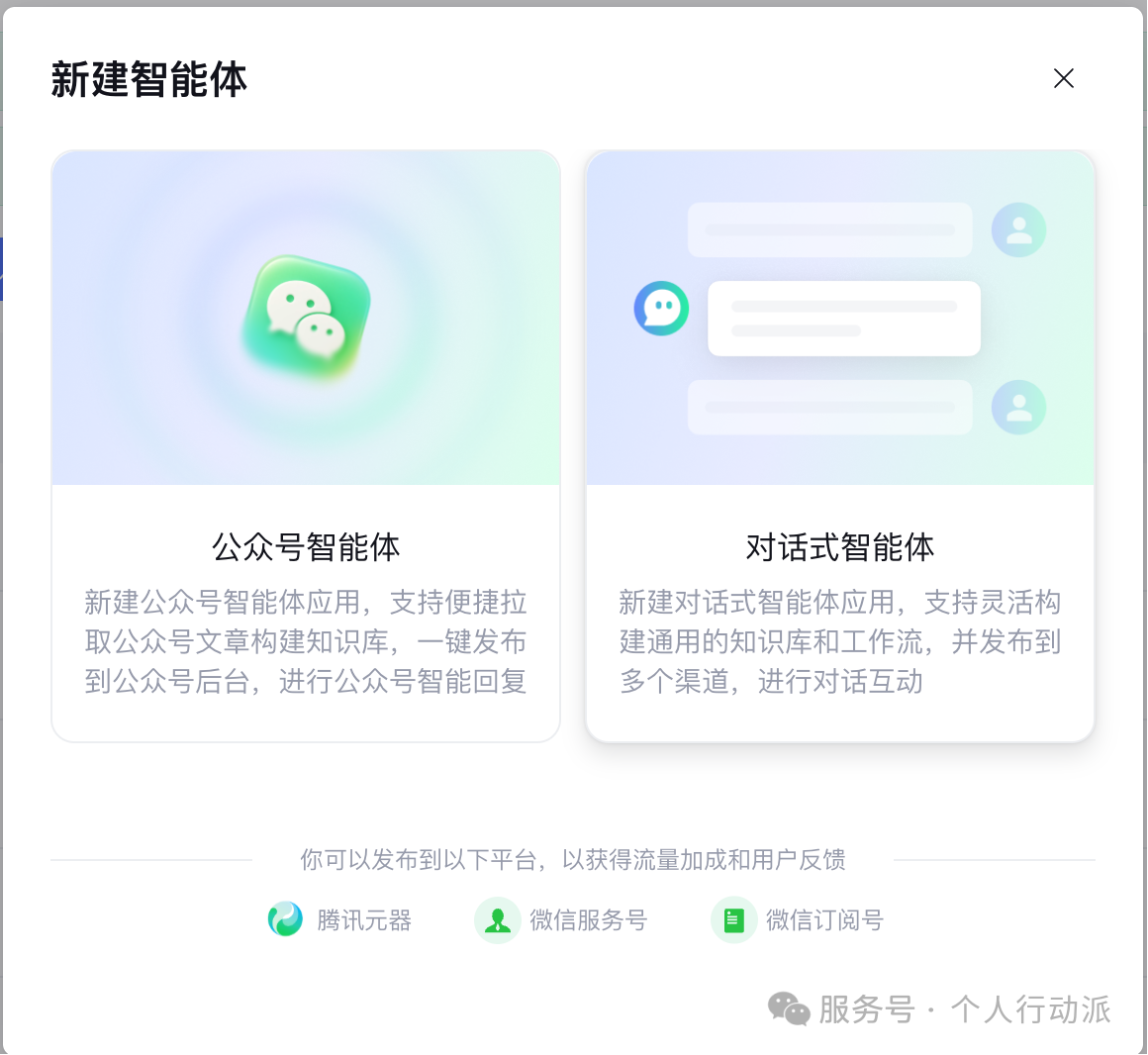 元器支持2种搭建方式,一个是专门放在公众号中的(需授权),还有个就是传统的对话式,我们选择对话式的就可以了。
