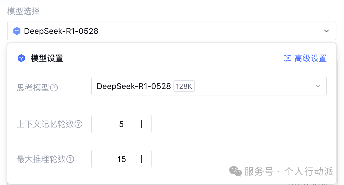 最大推力轮数:Agent 在任务执行过程中「思考+工具调用」的轮数上限,超过后将基于当前结果生成回复。复杂任务建议增加轮数,但会增加 token 消耗。