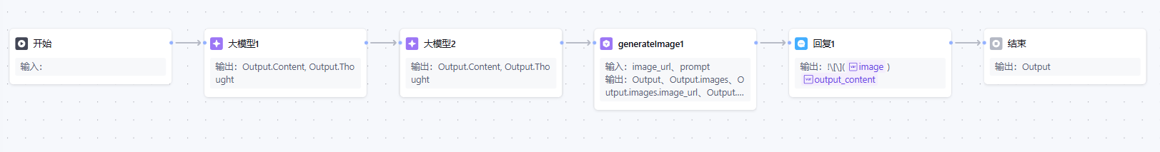 本智能体用单工作流搭建完成,流程如下:大模型1读取用户输入→输出本轮剧情、选项→大模型2读取大模型1输出的剧情→输出文生图提示词→混元文生图插件读取提示词→输出图片URL→回复插入的图片+大模型1输出