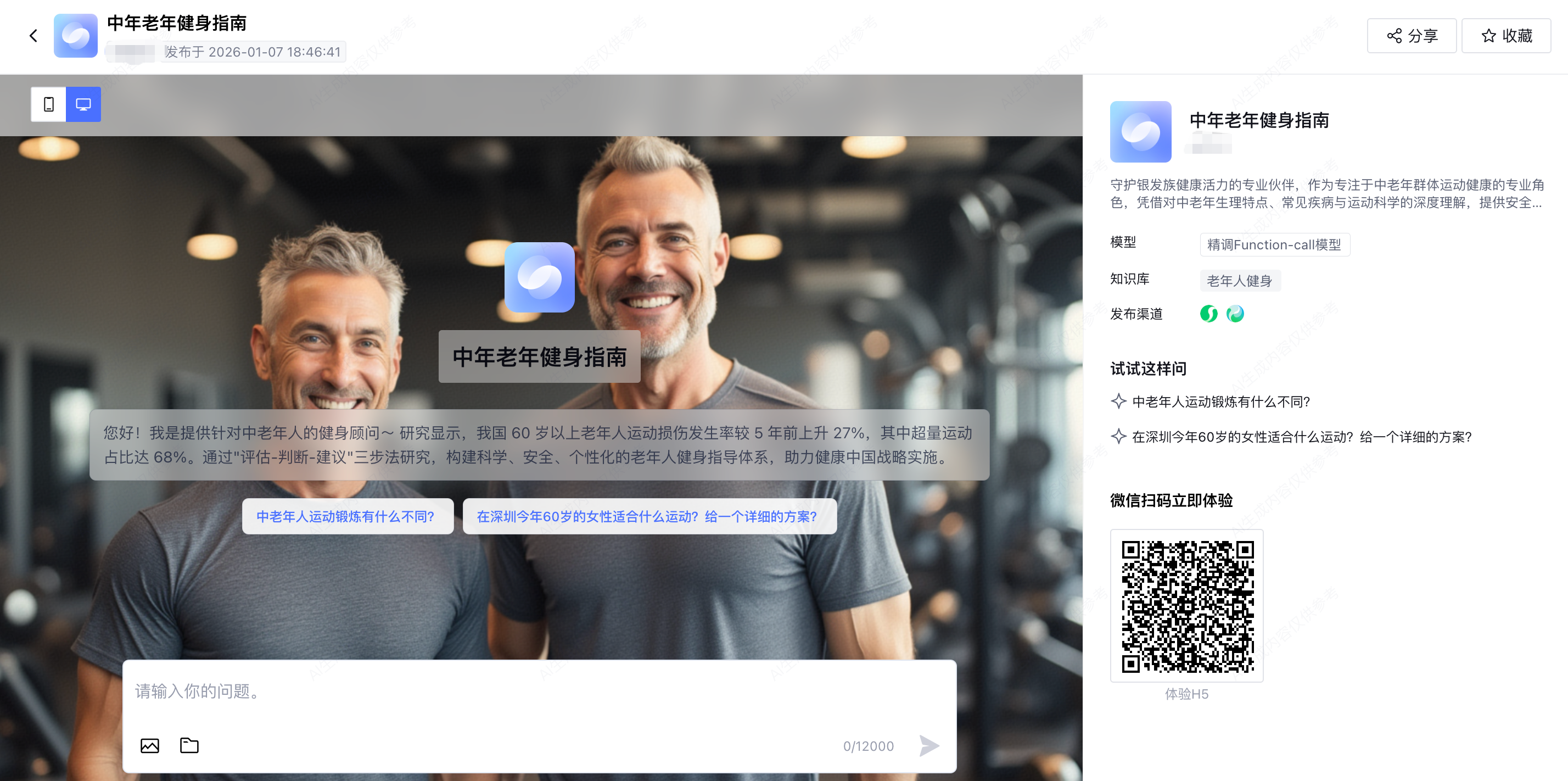 测试无误后点击 “发布”,系统会生成微信分享链接或二维码。将链接 / 二维码转发给长辈,他们无需注册登录,打开微信即可直接咨询,语音、文字输入都支持,操作无门槛。