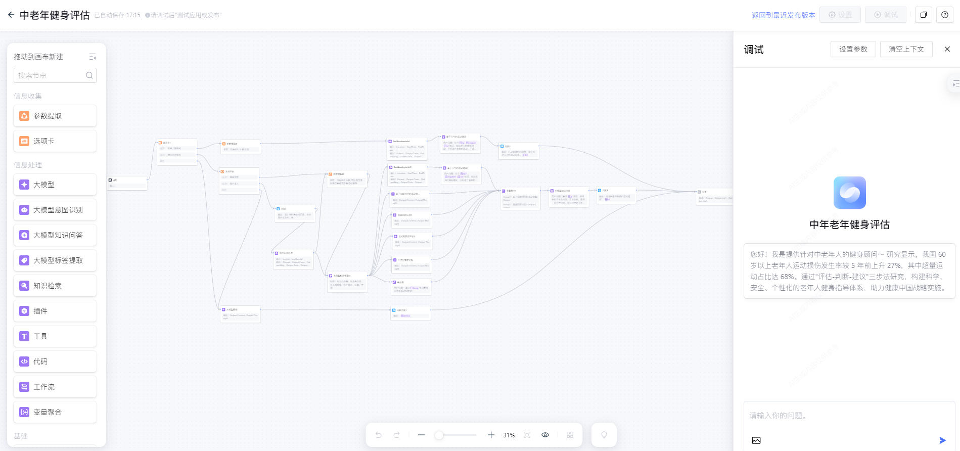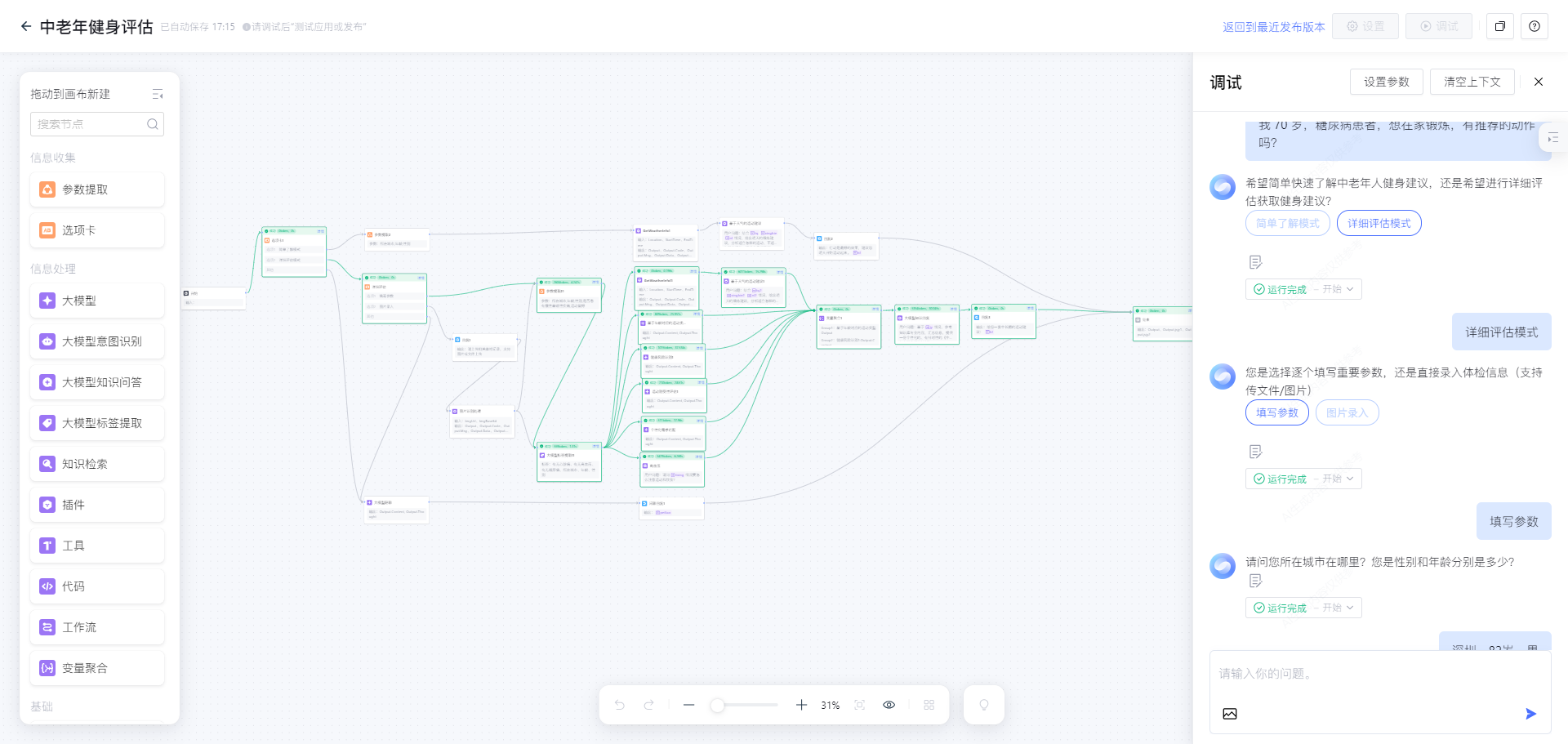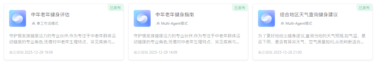 每个流程节点只专注一件事,不添加无关功能(如暂不支持运动打卡、 calorie 计算),减少智能体决策负担,提升回复的精准度和效率 —— 对长辈而言,“把安全运动建议说清楚” 比 “功能多而杂” 更重要。