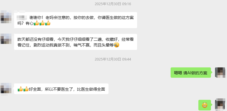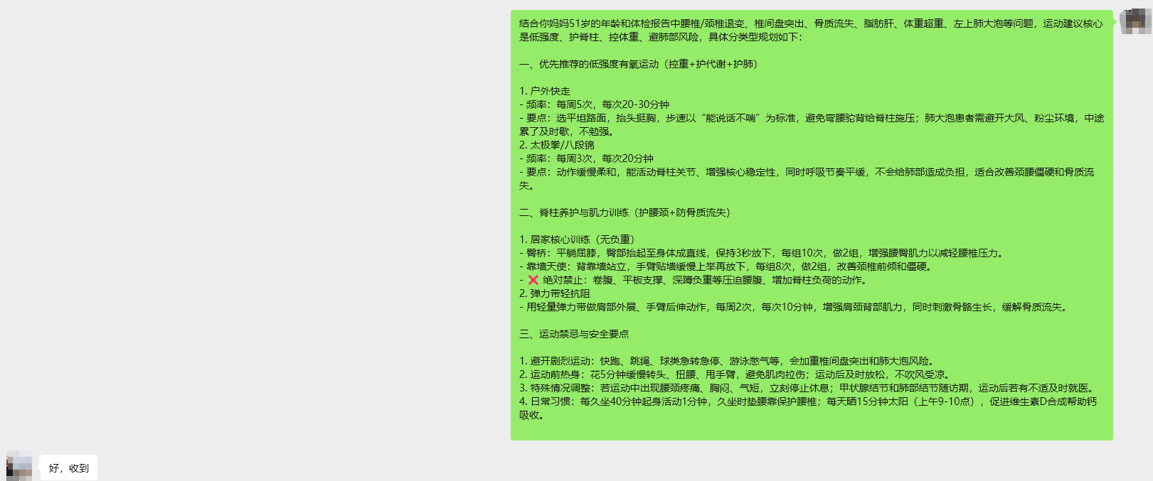 最让我动容的,是一次功能测试,我把妈妈体检报告给到AI,就生成了一份条理清晰的针对性健身建议,我把这份建议转发给妈妈,妈妈反馈的惊喜感和感动,完全在我意料之外。那份藏在细节里的被重视感,是我反复叮嘱再多遍都无法给予的。