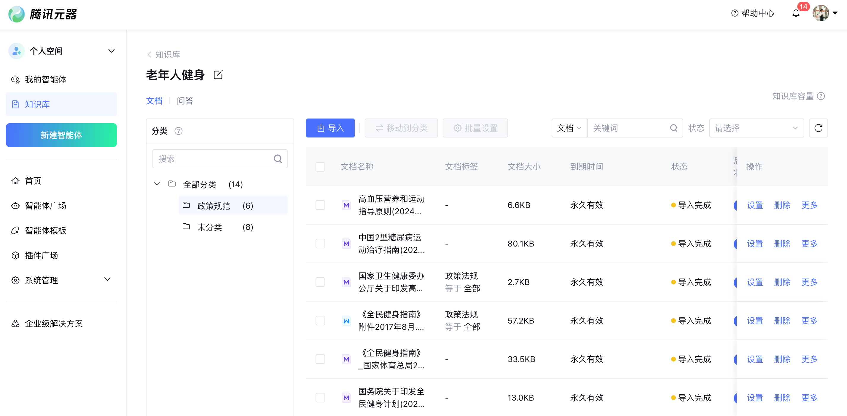 点击页面上的 “添加知识库” 按钮,将本地准备好的《老年常见疾病运动指南》《《中国老年人运动健康指导手册(摘要)》等专业文档上传。上传完成后,只需耐心等待 1 – 2 分钟,系统就会自动解析这些文档,将其中的专业知识转化为智能体可以理解和运用的信息 。