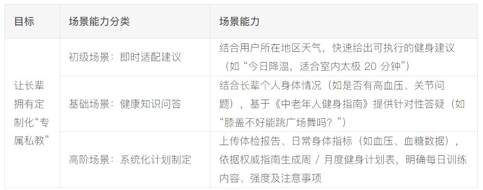 老年人健身的核心痛点在于 “无差别指导” 和 “流程断裂”,因此设计思路聚焦 “判断 – 评估 – 建议 – 提醒” 全闭环。如同专业医生的诊断逻辑,先明确用户情况,再分析适配方案,最后落地执行并跟踪,确保每一步都精准对接需求。具体场景能力拆解如下,从基础到高阶逐步递进:
