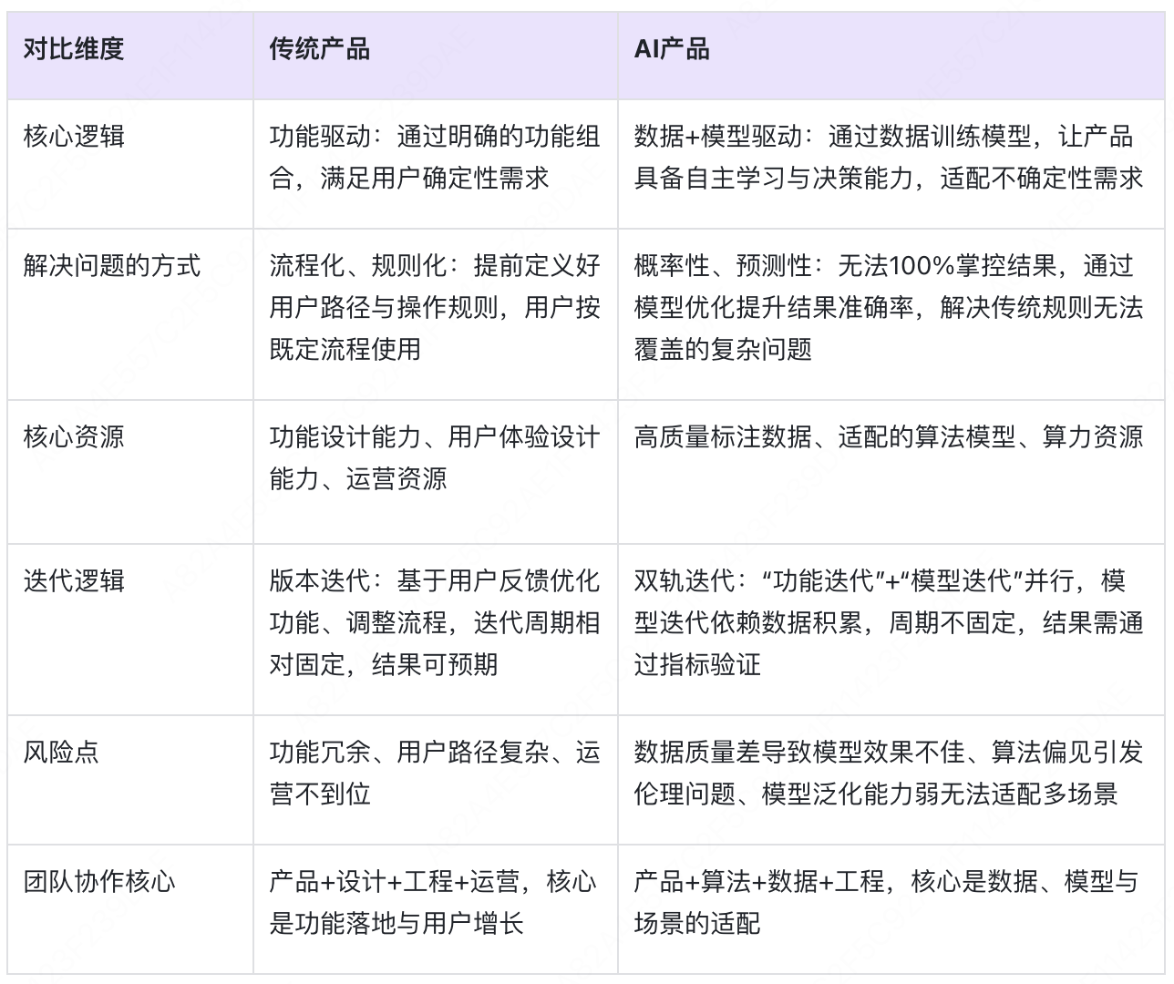 一、先看核心差异:一张表格分清AI产品与传统产品