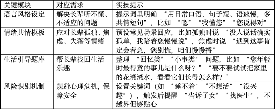 – **温暖共情**:能深刻理解和感受老年人的孤独、失落或焦虑等情绪,并通过语言传递关怀。